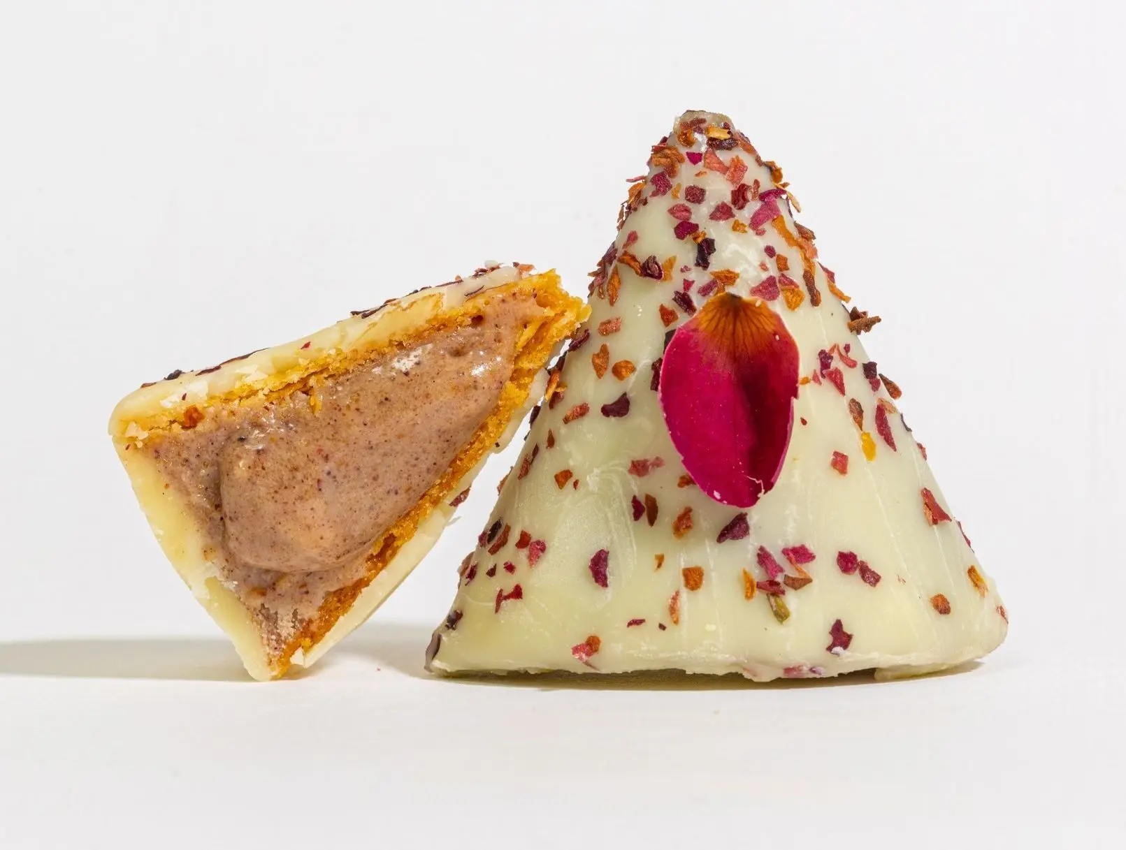 Ein cremiges Herz aus dunkler Schokolade, Feige und Walnuss, umhüllt von zartem Blätterteig, verfeinert mit Mandel- und Pistazienstückchen und einem Stück kandierter Feige für eine mediterrane Note.