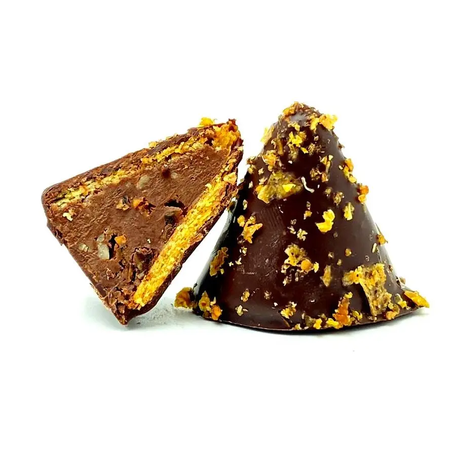 Ein weiches Herz aus dunkler Schokolade, Orange und Mandel, umhüllt von zarter Kräuselmasse und dunkler Schokolade, veredelt mit einer handgefertigten Scheibe hausgemachter Orangenscheiben.