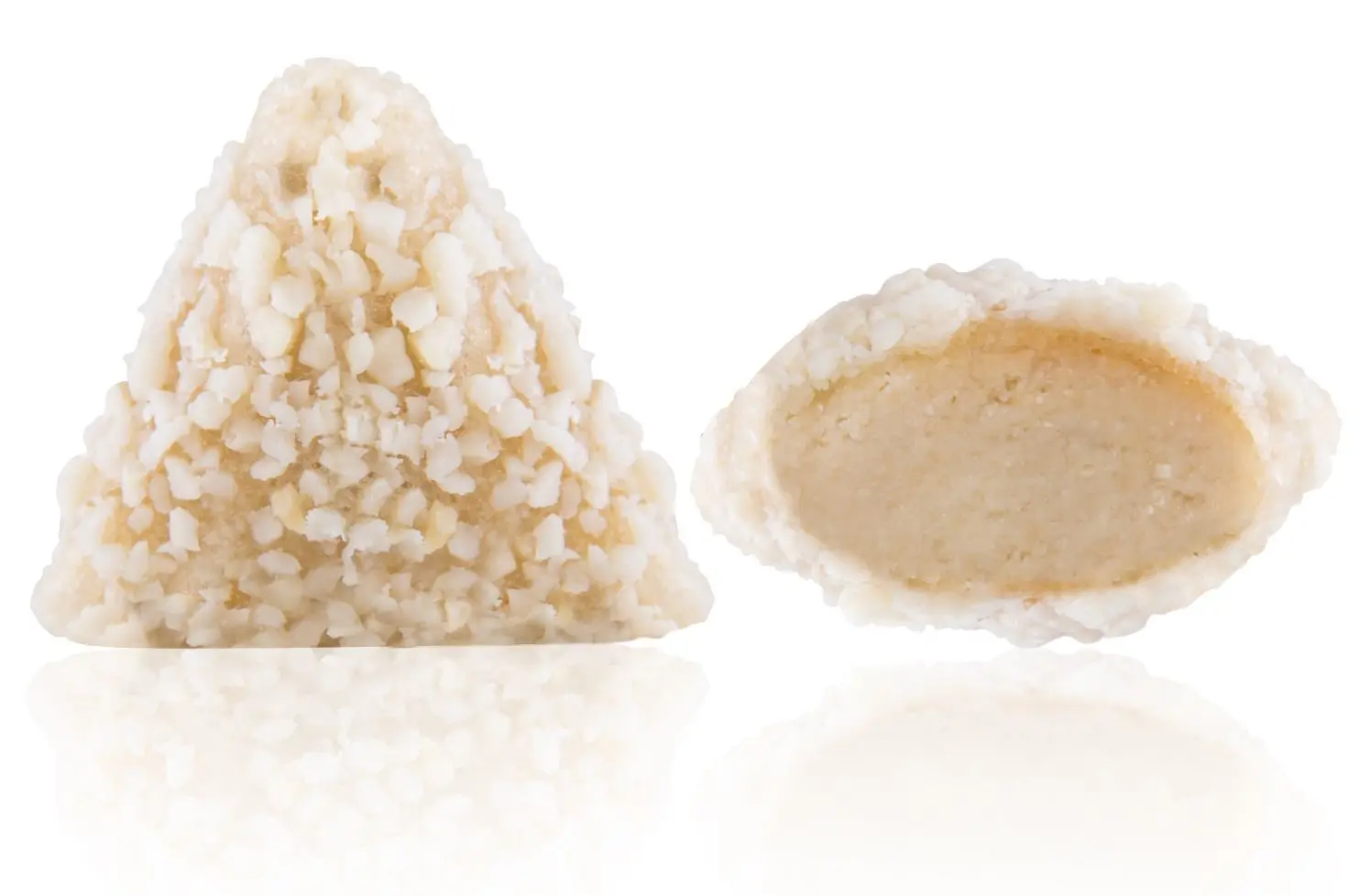 Mandel mit weißer Schokolade und Pistazie überzogen.