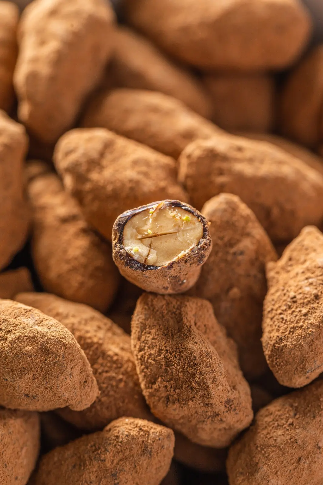 Mandel mit dunkler Schokolade und Kakao überzogen.