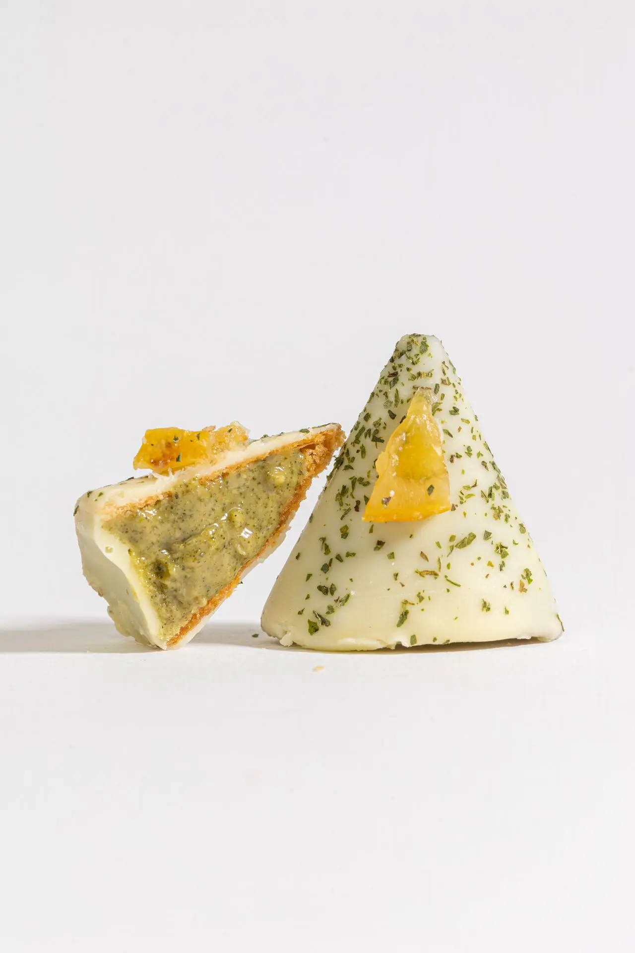Ein zartes Herz mit Eisenkraut, umhüllt von dünnem Blätterteig und Milchschokolade, fein bestreut mit Pistazienstückchen.