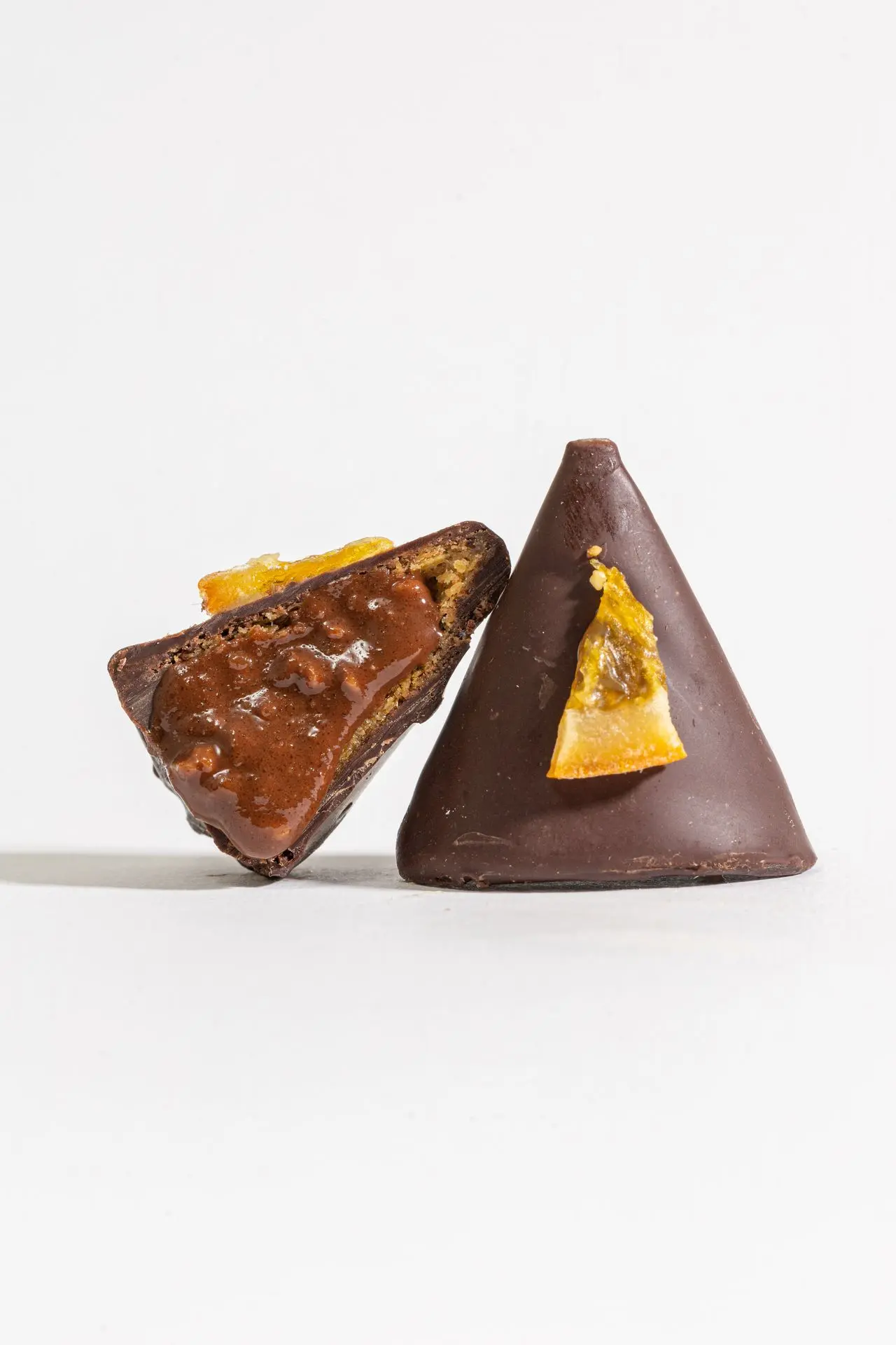 Ein weiches Herz aus dunkler Schokolade, Orange und Mandel, umhüllt von zarter Kräuselmasse und dunkler Schokolade, veredelt mit einer handgefertigten Scheibe hausgemachter Orangenscheiben.