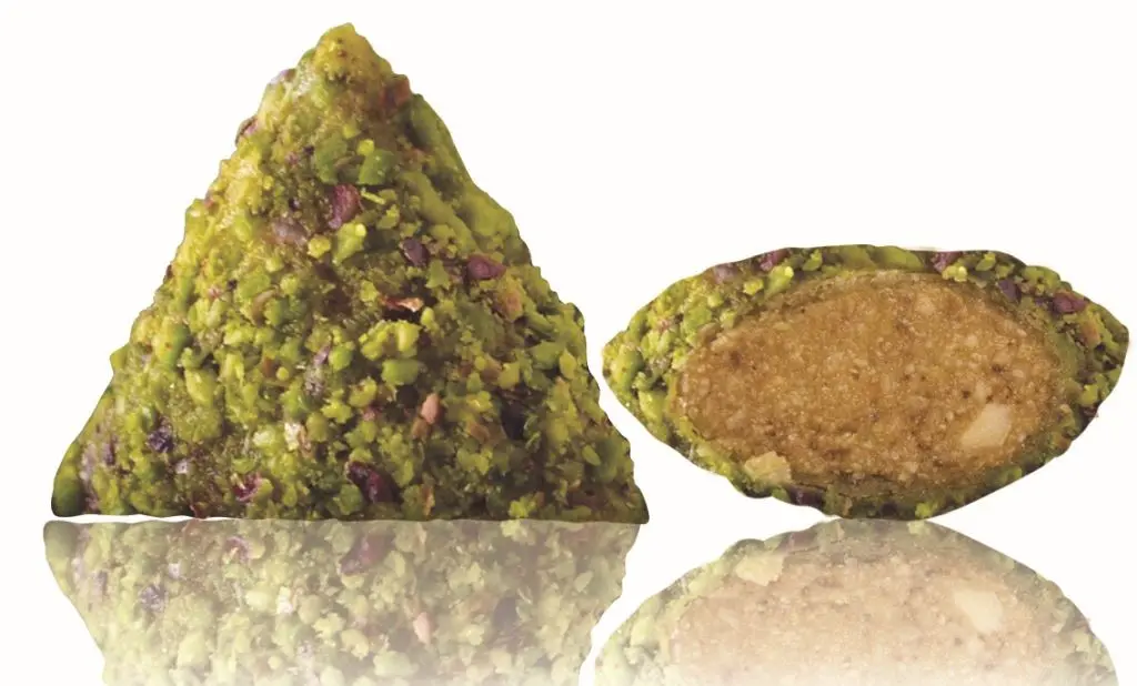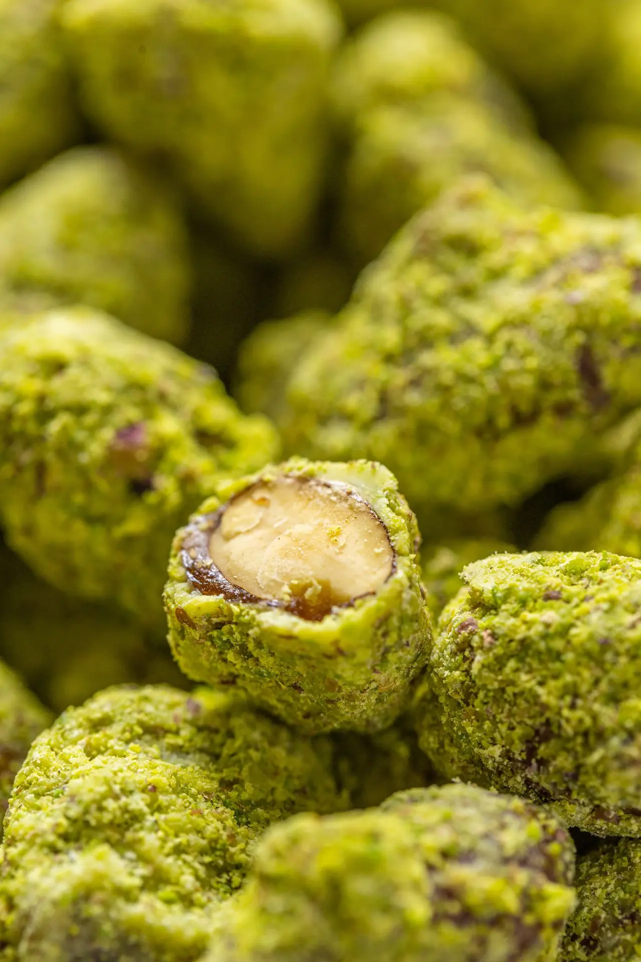 Mandel mit weißer Schokolade und Pistazie überzogen.